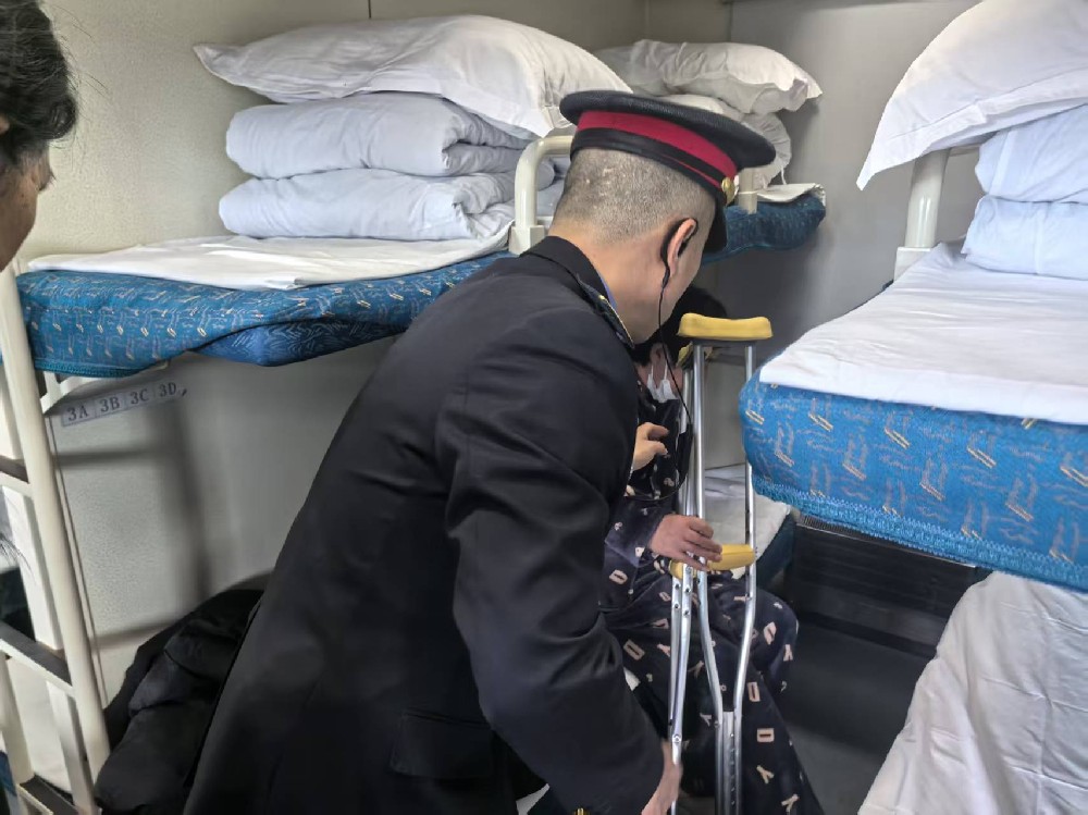 不仅如此,在列车10车厢内,丁海波还主动为另一位拄着拐杖的旅客协调铺位,耐心指引其就座,并叮嘱乘务员途中多加关注。他说:“重点旅客出门不容易,我们多搭把手,他们的旅途就能更安心。”
