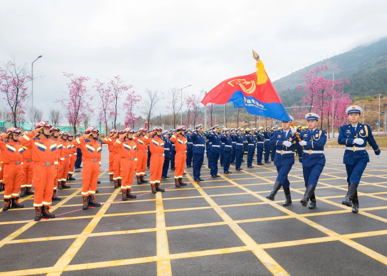 现场气氛庄重热烈,全体指战员整齐列队、士气高昂,高唱中华人民共和国国歌;随着迎旗指令下达,护旗手迈着铿锵有力的步伐护送中国消防救援队队旗入场,全体指战员面向队旗庄严敬礼。总队双主官共同为云南省消防救援总队特勤支队揭牌。红绸落定,标志着云南消防特勤队伍迈入高标准起步、高质量发展的全新征程,为全省灭火救援专业化能力提档升级奠定了坚实基础。