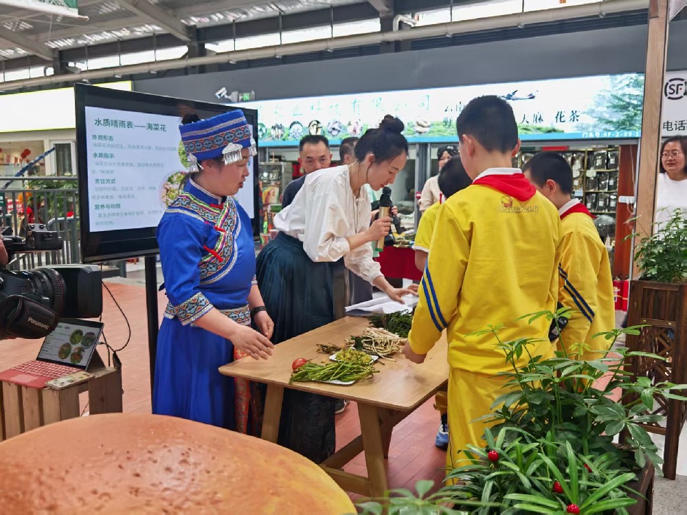 在活动现场,篆塘社区党员志愿者与大观篆新工会志愿者早早筹备到位,精心陈列香椿、金雀花、石斛花、海菜花、蕨菜等云南特色春菜实物,结合小学生认知特点,将专业食材知识转化为通俗易懂的讲解内容,让研学课堂接地气、有温度。在春菜知识科普环节,志愿者们化身研学导师,逐一介绍各类春菜的外形特征、生长习性与营养功效,穿插“雨前香椿嫩如丝”“蕨芽已作小儿拳”等春日诗词典故,融入《滇南本草》药食同源文化知识,还讲解了海菜花作为水质“晴雨表”的生态价值。同时通过互动提问,邀请孩子们分享春菜品尝经历、背诵春日古诗词,现场气氛热烈,孩子们在轻松的氛围中加深了对云南春菜的认知。
