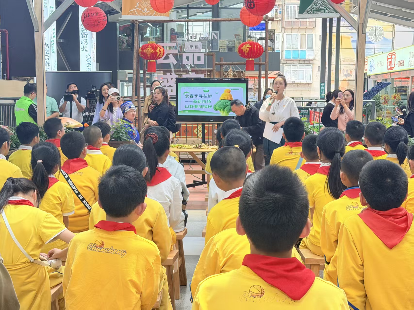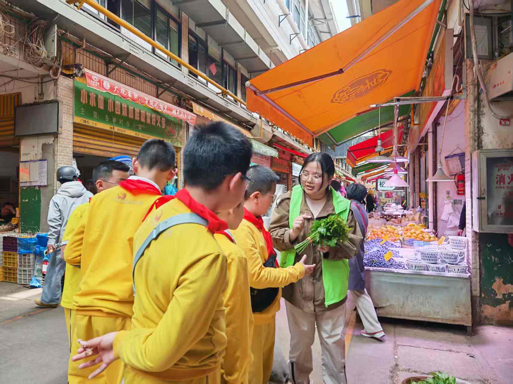 凤凰新闻网络电视台讯(记者张红飞)清明将至,春意盎然,云南特色春菜迎来最佳食用时节。4月2日下午,大观街道篆塘社区携手新闻路小学、云南建投第三建设有限公司、云南大观篆新产业运营服务有限公司,在大观篆新农贸市场举办“党建引领聚民心,志愿服务暖万家”山野春味探秘研学活动,40余名新闻路小学五年级学生走进这座昆明知名的“春天菜篮子”,在党员志愿者的带领下,探寻春菜奥秘,感受春城春日烟火与传统文化交融的独特魅力。