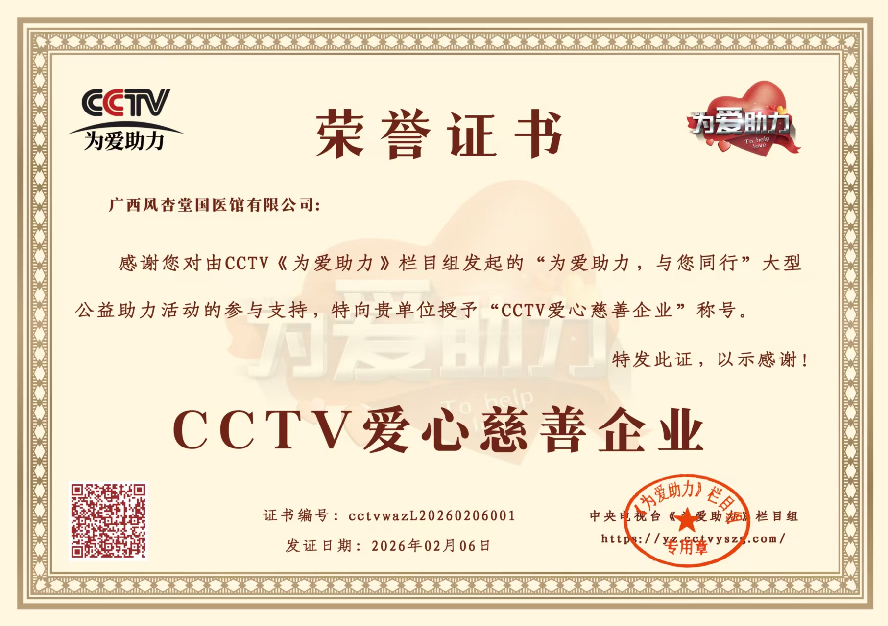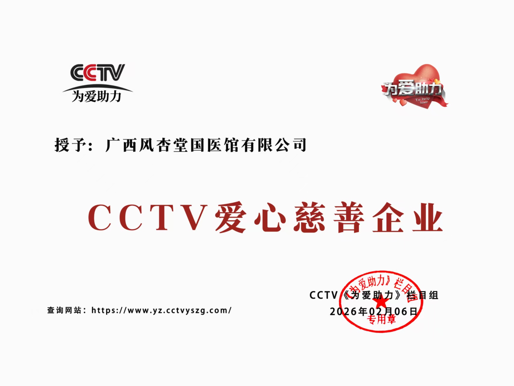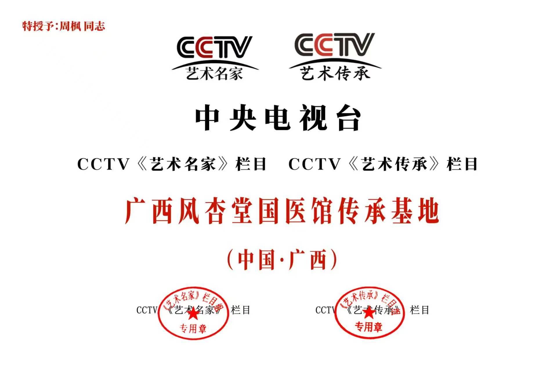 广西风杏堂国医馆开馆以来,在周枫女士带领下工作成效卓著。中央电视台认为其在弘扬中国传统文化,传承艺术文化精髄,中医技术文化创新等领域做出了突出贡献,近期央视多个部门授予了风杏堂国医馆及周枫女士,CCTV爱心慈善企业和广西风杏堂国医馆传承基地(中国 广西)等荣誉。