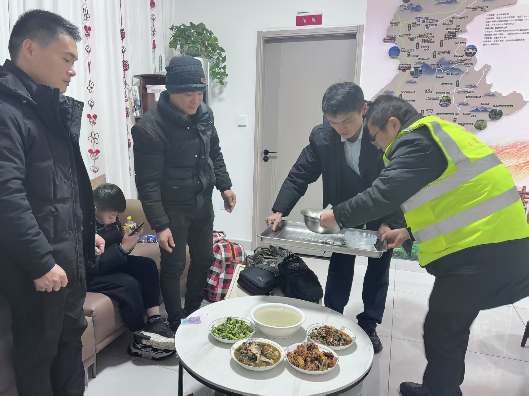 上栗收费站工作人员发现情况后,第一时间将周师傅一家人引导至综合服务站避雨取暖,为他们递上热水,耐心安抚着一家人的情绪。期间工作人员主动帮忙对接救援队,实时告知处置进展,让悬着心的周师傅逐渐安定下来。得知一家人因事故耽误用餐,工作人员立刻准备了热气腾腾的饭菜,让冰冷的雨夜里,多了一份暖胃又暖心的慰藉。