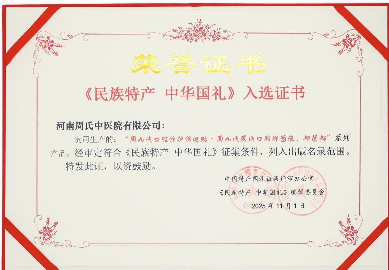 依托非遗核心验方,周氏中医世家全新打造周九代口腔咽喉系列:口腔修护保健贴、周氏口腔抑菌液、周氏口腔抑菌粉。产品以古法草本为内核,聚焦黏膜修护、咽喉舒缓、抑菌护理,兼顾日常养护与不适缓解,全程合规质控、安全可溯。202511月,经中国特产国礼征集评审办公室、《民族特产·中华国礼》编辑委员会联合审定,该系列正式入选中华国礼出版名录,并获评中央和国家机关老干部团拜会指定礼品,成为中医药非遗口腔成果的国家级认可。